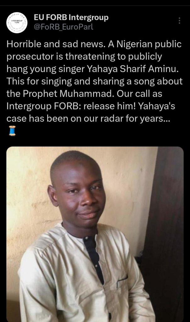 The European Parliament has called for the immediate release of Nigerian Sufi musician, Yahaya Sharif-Aminu, who was accused of blasphemy over a song about Prophet Mohammed.
