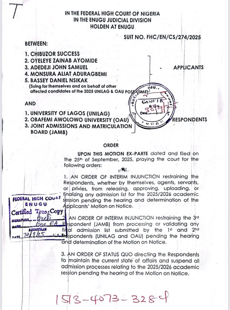 The Federal High Court sitting in Enugu has ordered the University of Lagos, UNILAG, Obafemi Awolowo University, OAU, and the Joint Admissions and Matriculation Board, JAMB, to suspend all admission processes for the 2025/2026 academic session.